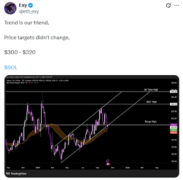 Exy, a leading crypto expert on X, predicts the Solana coin will trade between $300 and $320 this cycle. At the current price, it has modest upside potential, making it an investor favorite despite growing market uncertainties arising fromTrump’s 100% tariff threat against China.