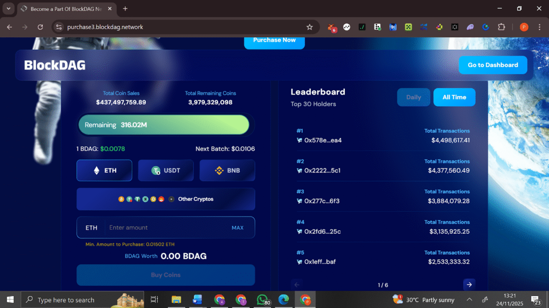 BlockDAG sits at the top of many “best crypto presale to buy now” lists because of its numbers alone. The project has raised more than $437 million, with Batch 32 currently priced at $0.0078 per BDAG token. More than 312,000 buyers from over 130 countries have already taken part, and only about 3.9 billion coins remain before the presale closes in early 2026.