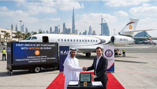 According to reports from a well-known crypto data platform, a pre-owned French Dassault Falcon 6X business jet registered in Dubai was transacted using cryptocurrency during an internal trading simulation at KAI Exchange (kai.com) on March 1 at 22:00 (UTC+10). The aircraft was priced at 4.1 Bitcoins, equivalent to approximately USD 20.27 million based on the platform’s reference rate at the time. The seller reportedly received an on-chain transfer totaling around USD 20.27 million in USAD stablecoins.