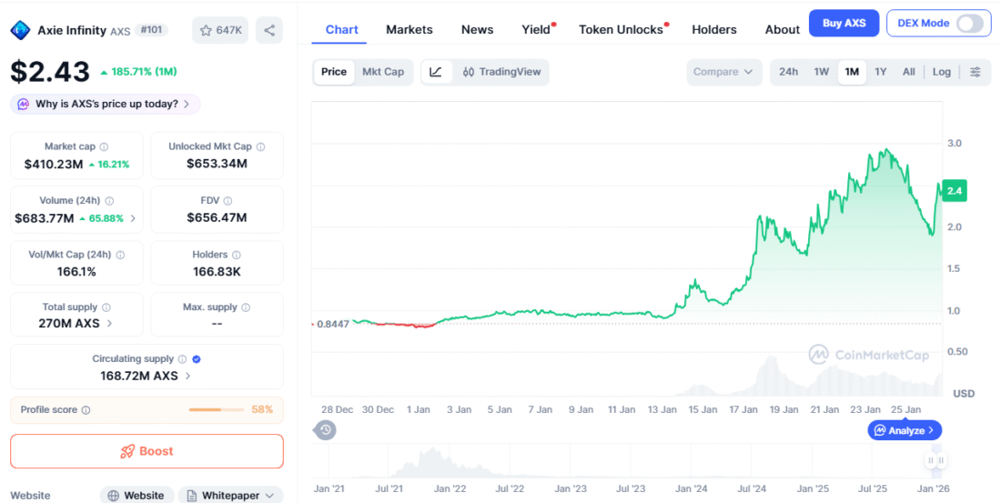 Axie Infinity has introduced the bAXS app token, with a new staking mechanism. AXS soared 189 percent in a month as the project declared its Q1 2026 launch plans and cleared security audits.