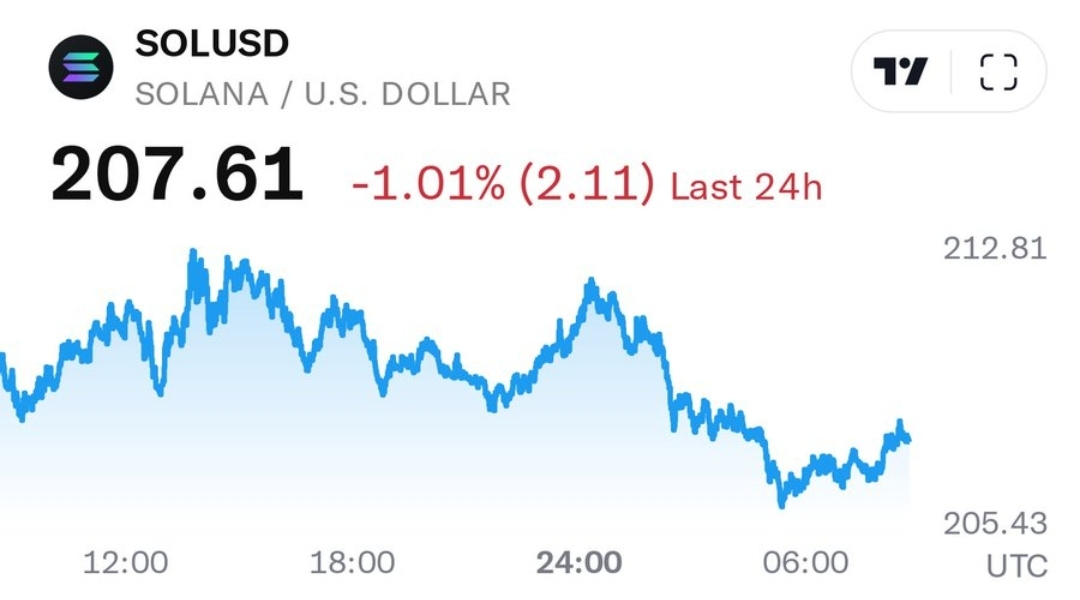 Solana is priced near 207 USD, showing support around 205 and resistance at 213, per TradingView. It continues to build traction with developers and meme coin communities, which has helped drive higher transaction activity.
