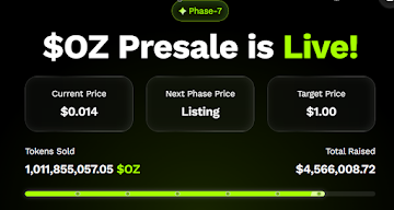 The $OZ presale funding has reached $4.56 million. Early backers who bought at $0.001 per token are now up 12x from the current price of $0.014. With strong presale momentum, the end presale price is projected to reach $1. Investing now could deliver an 83x return and a 1000x increase from the first presale price.