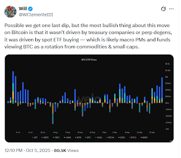 A fresh wave of institutional money is pouring into Bitcoin (BTC) through spot ETFs. The first week of October saw one of the largest weekly inflows ever, helping push Bitcoin to a new all‑time high above $125,000 on October 5.