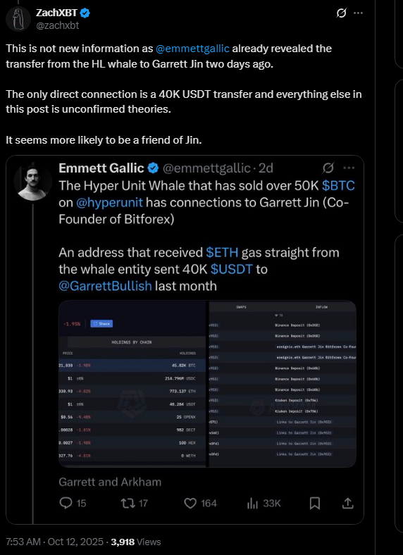 Subsequent on-chain research proposed minute links between the wallet of the whale and those of Garrett Jin, a former CEO of the now-defunct exchange BitForex, due to similarities in wallet activity and shared transaction addresses.