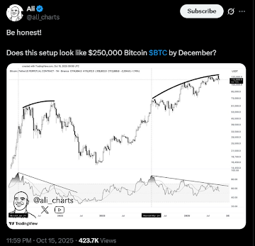 According to Ali Martinez, BTC’s current setup doesn’t look like one that will take the Bitcoin price to $250,000 soon, but the opposite. This statement also signals that he expected the BTC price to decrease more in the coming weeks, which is on par with historical patterns.