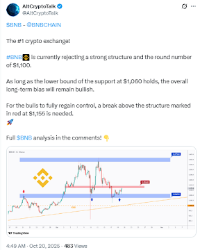 Strong support above $1,000 indicates that investors are happy to jump in at these levels. Its ability to command a four-digit price tag is based on the fact that BNB carries inherent demand from exchange users (for trading fee discounts, staking in BNB Chain), which makes it a desirable token to hold.