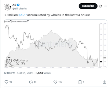 The negative sentiment is taking a turn, and investors are eyeing more encouraging recent data. On Oct. 21, it was reported that whales have accumulated 30 million XRP tokens over the last 24 hours.