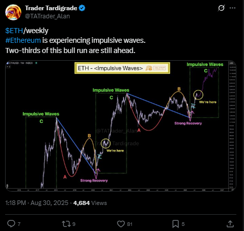 Ether itself is demonstrating a trend with X user TATrader_Alan reporting impulsive bullish movements in the ETH weekly charts. According to him, two-thirds of the present rally is yet to come, meaning that there is a lot of upside to it.