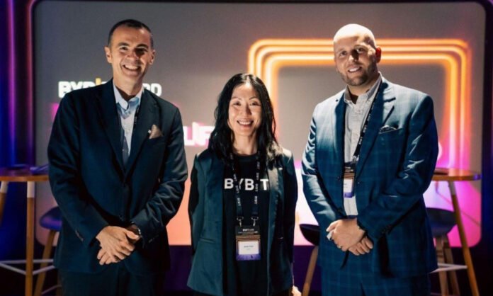 Mete Guney (left), Executive VP, Market Development, Mastercard, Eastern Europe, Middle East and Africa, Joan Han (middle), Head of the Payment Business Unit at Bybit, and Oliver Silvey, Director, Head of Crypto & Digital Assets, Mastercard, at Bybit Card’s second anniversary event on Mar. 7, 2025 in Dubai