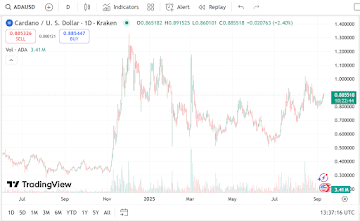 Cardano is among the most recognizable blockchain names, supported by decentralization, scalability, and cheap gas fees. The ADA Price today is $0.8759, falling by a modest daily 0.94%. Its market cap is $31.29 billion, placing it in the most capitalized of cryptocurrencies, but still way behind Ethereum. Trading volumes are about $1.3 billion, down 22.1%, reflecting declining short-term momentum.