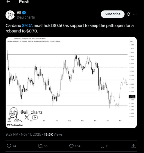 ADA is now approaching critical support of $0.50 following a 20% drop. Find out why this level may lead to a rebound to $0.70 in the near future.