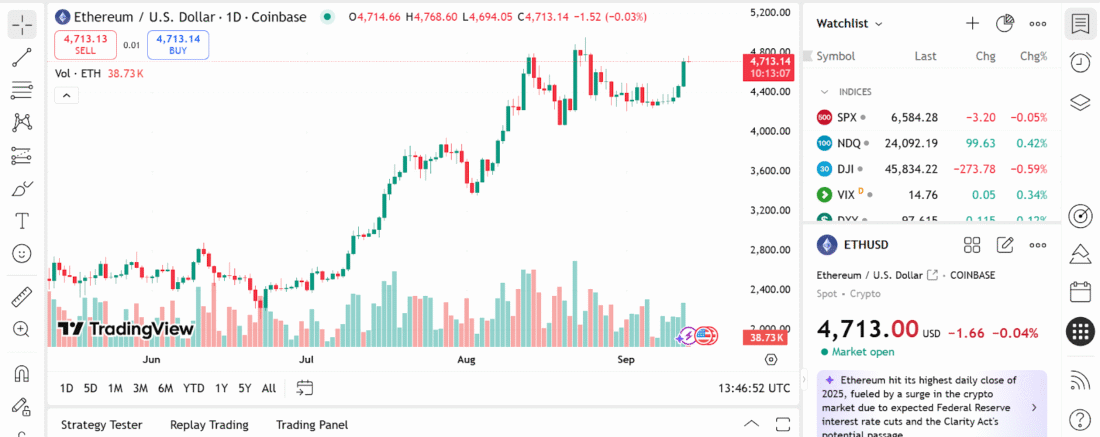 Ethereum news adds contrast. ETH recently pushed above $4,700 support and flirted with near $5,000 resistance, with forecasts targeting $4,950 to $5,200 in the upcoming weeks if buyers remain strong.