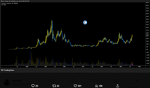 Crypto analyst Crypto Bullet described the weekly chart as “very strong” and suggested that the token could move toward $100 by year-end. While ambitious, such commentary reflects the optimism now visible across social media and trading communities.