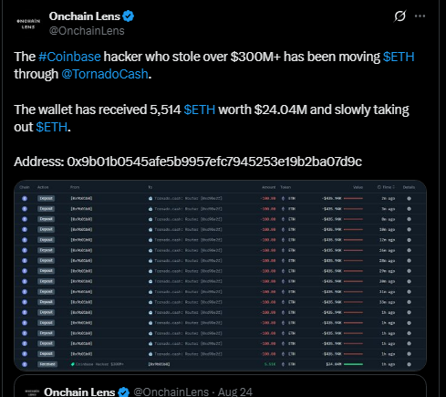 A cybercriminal related to the giant Coinbase theft has been quietly laundering stolen Ethereum to the tune of $24 million with Tornado Cash.