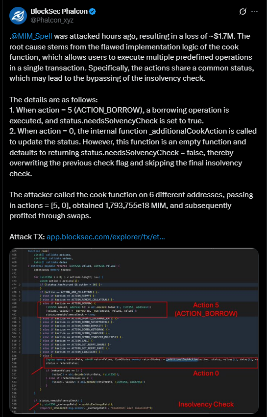 This loophole evaded insolvency checks that were to ensure the avoidance of excessive borrowing. The attacker exploited this vulnerability by making six calls to the cook function using six addresses, which drained 1.79 million MIM tokens from the protocol.