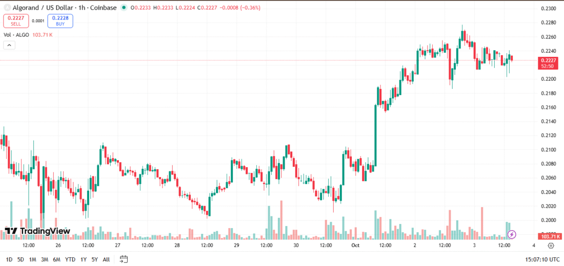 Algorand (ALGO) is currently trading at $0.22. Its DeFi ecosystem grew TVL by 33% recently, supported by developer adoption and interoperability upgrades.