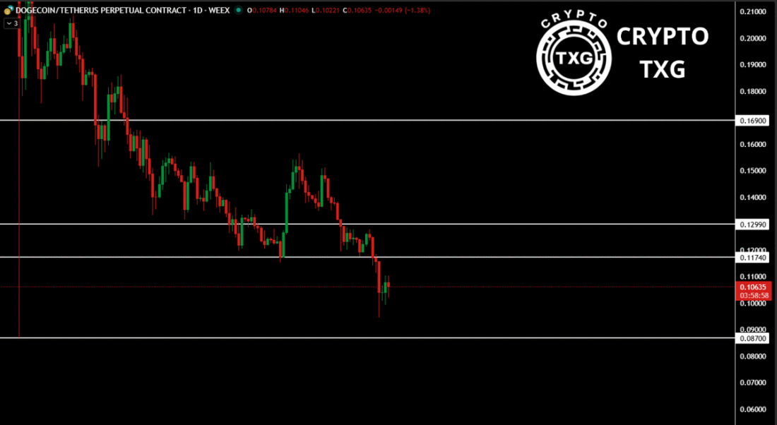 Dogecoin price today is hovering near $0.1046 after a brief 1.33% bounce, but broader DOGE news remains cautious. DOGE price slipped below the $0.1174 support. This slip has now put pressure on the next key level around $0.087. Analysts tracking DOGE price prediction are closely watching the 1W MA350, a level that has historically defined bear-cycle bottoms.
