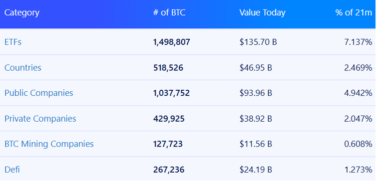 Institutional and government ownership now represents a notable share of Bitcoin’s fixed supply. As per data from BiTBO, Exchange-traded funds alone hold close to 1.5 million BTC ($135 billion), roughly 7.1% of the total supply.
