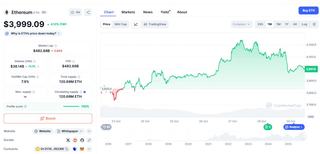 CoinMarketCap data shows that the Ethereum price has been sluggish in the past week. Bulls have failed to hold the $4,000 support, leading to constant declines. Indicators mirror the downtrend.