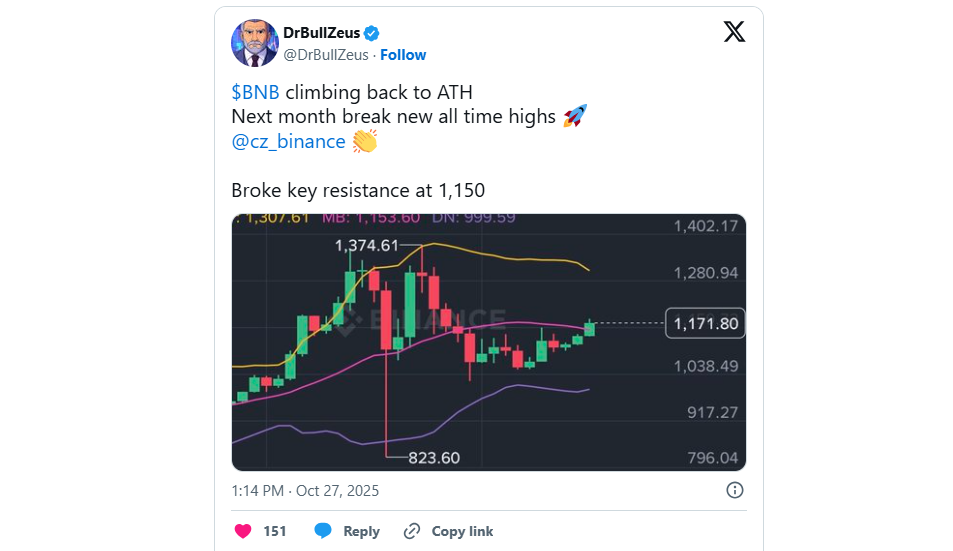 <blockquote class=”twitter-tweet”><p lang=”en” dir=”ltr”><a href=”https://twitter.com/search?q=%24BNB&src=ctag&ref_src=twsrc%5Etfw”>$BNB</a> climbing back to ATH <br>Next month break new all time highs 🚀 <a href=”https://twitter.com/cz_binance?ref_src=twsrc%5Etfw”>@cz_binance</a> 👏 <br><br>Broke key resistance at 1,150 <a href=”https://t.co/Q9K7ZL4AJH”>pic.twitter.com/Q9K7ZL4AJH</a></p>— DrBullZeus (@DrBullZeus) <a href=”https://twitter.com/DrBullZeus/status/1982782879668007418?ref_src=twsrc%5Etfw”>October 27, 2025</a></blockquote> <script async src=”https://platform.twitter.com/widgets.js” charset=”utf-8″></script>