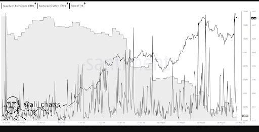 Ethereum’s exchange activity comes after a sharp rebound from its early-year low of $1,400. The token has since surged past $4,800, setting a new all-time high last week. Market participants now watch closely for signs of consolidation before another move higher.