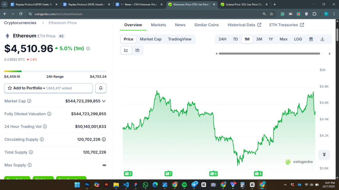 Like many altcoins, Ethereum is trading bullishly in October following Bitcoin’s $125k charge. At the time of writing, ETH trades for $4,510. This represents 5.2% gains compared to the previous month.