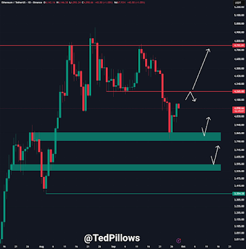 Well-known crypto analyst Ted Pillows believes Ethereum must reclaim the $4,250 level to trigger a bullish move. If not, the price could slide back to the $3,600-$3,800 zone before recovering. He predicts that the correction phase will end in a few weeks, setting the stage for Ethereum to surpass $10,000 in the next major bull cycle.