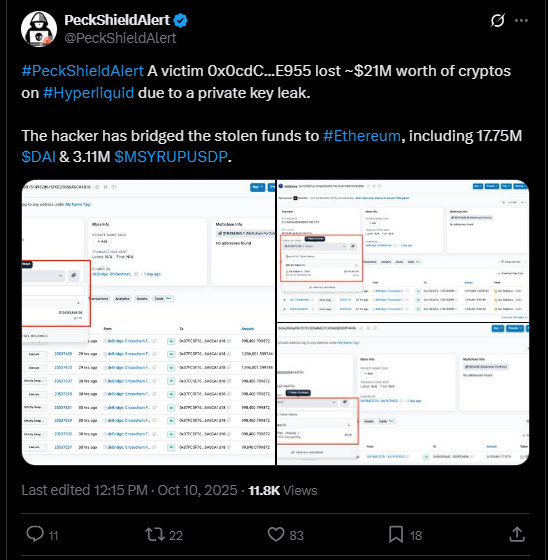 A Hyperliquid user suffered a leak of private key to a $21 million crypto theft, one of the largest security risks in crypto.