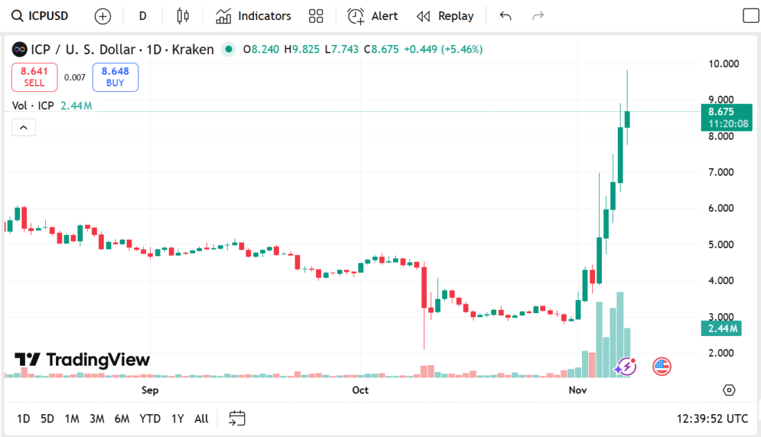 ICP price prediction has completely flipped this week after a surprise 170% rally. At the moment, Internet Computer sells at $8.64, up 6.53% in the last 24 hours. The market capitalization has reached 4.51 billion, while trading volume stands at $1.52 billion, up 1.68%.