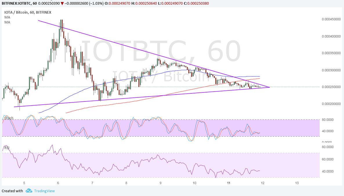 Against the dollar, IOTA has a bit more room to consolidate before reaching the end of the triangle. Price is hovering close to the triangle resistance at the moment and the 100 SMA is adding an extra layer of resistance.