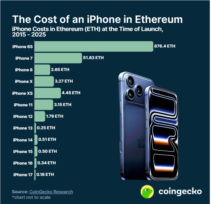 Ethereum is not an exception. iPhone 17 is priced below the iPhone 16 at 0.1866 ETH and 0.3386 ETH, respectively, which is a 44.9 percent drop. The ETH prices increased by 84 percent in approximately two years, between the prices of about 2,360 and 4,280.