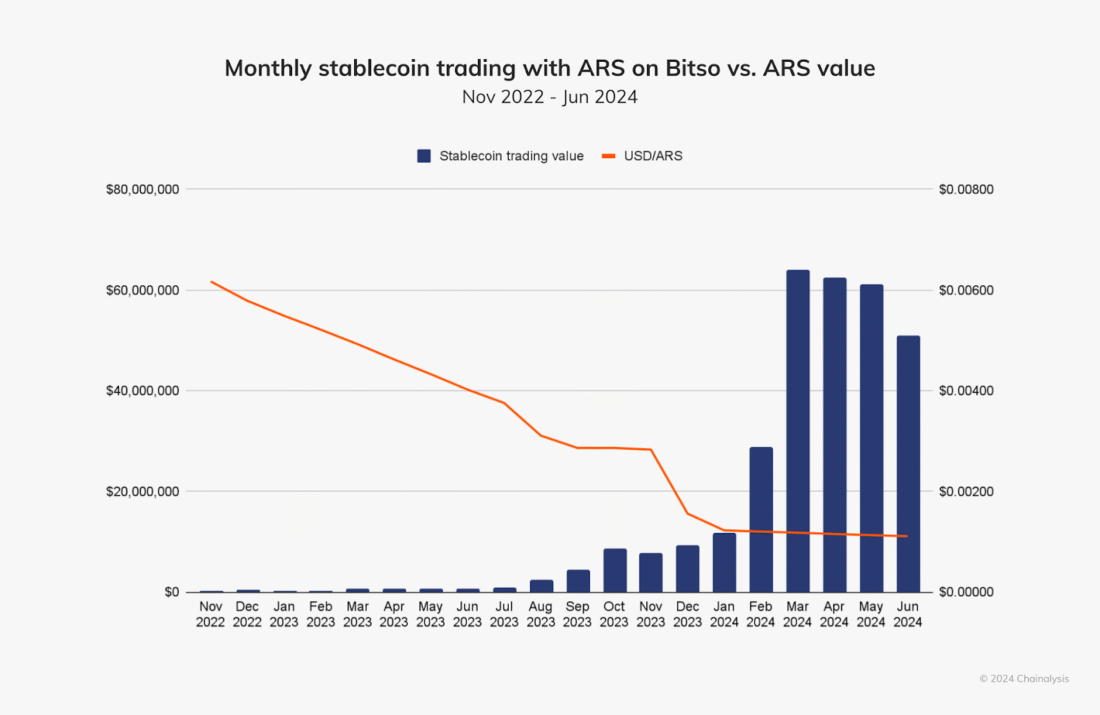 On the Bitso crypto exchange, the monthly stablecoin trading volume surged exponentially in 2024 compared to that of fiat currencies.