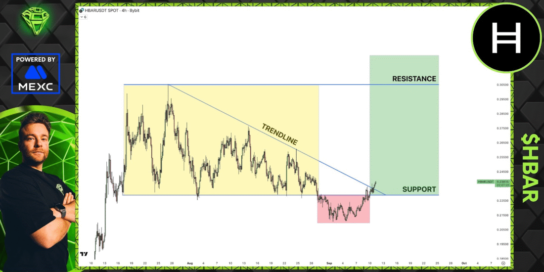 Technicals affirm what HBAR news reveals as the crypto recently broke from the trendline and created a classic Power of 3 setup. It is thought that as long as it holds support, there could be a spike.