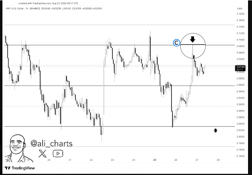 Market commentators remain divided, with some warning of a possible retracement and others anticipating a strong continuation of the uptrend. Ali Charts, a crypto analyst, noted that XRP failed to break $3.10 and could revisit $2.83. This view reflects caution as the token remains under pressure from resistance levels.