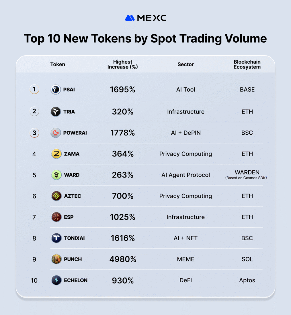 In February, MEXC’s top 10 newly listed tokens by spot trading volume averaged a peak gain of 1,367%. AI and infrastructure projects were well represented: POWERAI (+1,778%), PSAI (+1,695%), TONIXAI (+1,616%), and ESP(+1,025%) led the volume rankings, with privacy computing tokens ZAMA and AZTEC and DeFi protocol ECHELON(+930%) rounding out a list that skewed heavily toward technical and infrastructure assets.