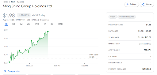 According to Google Finance, Ming Shing stock has lost more than 70% of its value over the past 12 months. This includes a 44% drop in the past month and a 24% fall in the last five days alone.