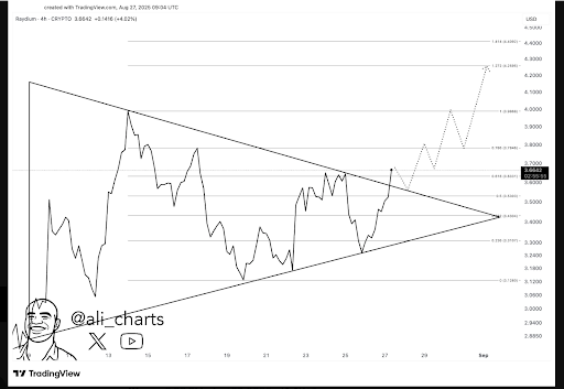 Ali Charts noted on X that the breakout from the triangle pattern points to a near-term target of $4. Analysts monitoring the price structure have said the Elliott Wave formation suggests the token could extend gains if momentum is sustained. With RAY still well below its all-time high of $16.24, investors are watching closely for confirmation of further upward movement.