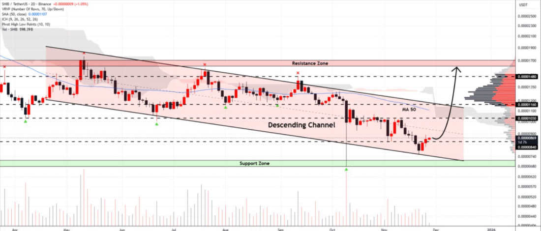 Analysts tracking SHIB note that the token is still holding within a descending channel pattern on the 2D timeframe, according to recent community analysis.