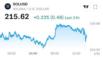 Solana trades around $215.62, showing strength after recent gains. Support is visible near $210.54, while resistance sits close to $219.86. Analysts say approval of a Solana ETF could open new institutional flows, but the outcome remains uncertain.