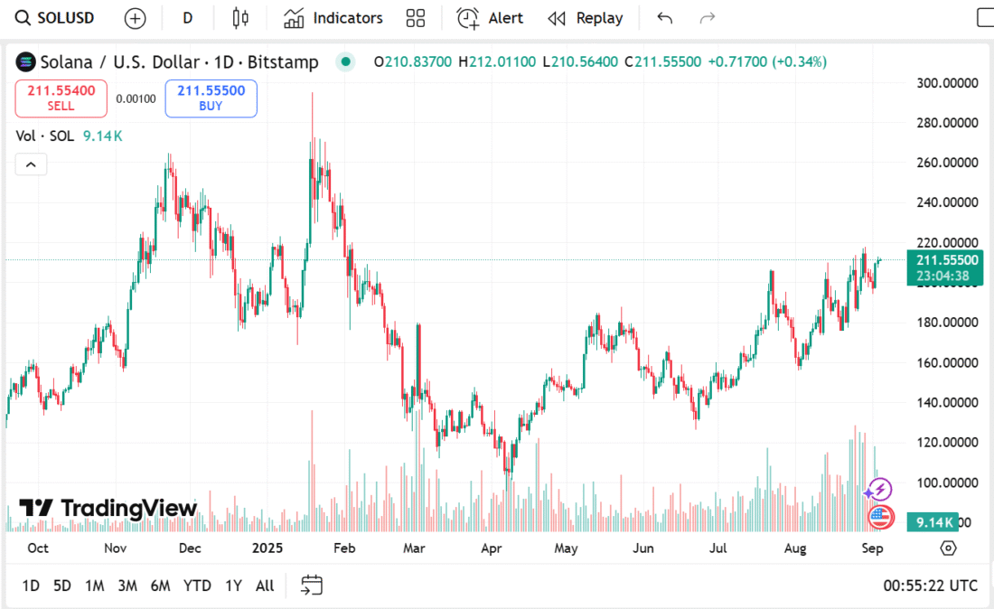 The Solana price has remained resilient in the vicinity of the $210 mark, an indicator of resilience in one of the most advanced blockchain ecosystems. With its speed and low gas fees, Solana has come to be a leading destination for decentralized finance, NFTs, and Web3 applications.