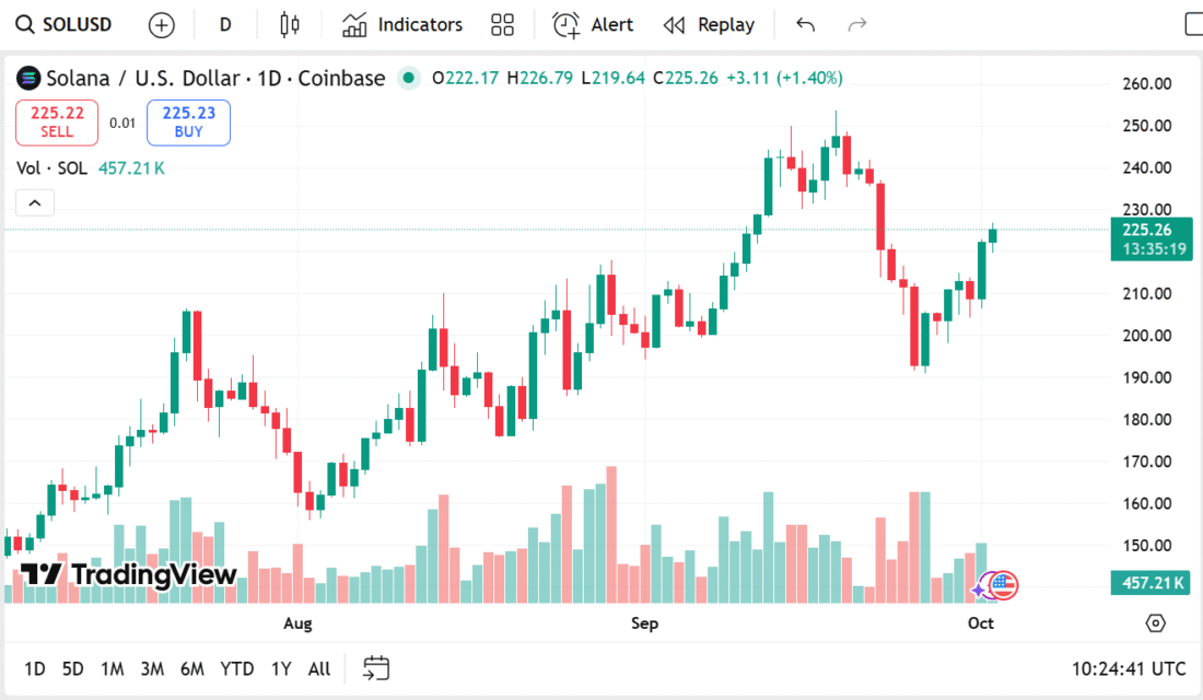 In looking at any Solana price prediction, focus usually goes beyond chart prices. As of now, when writing this, Solana is at $225.22, up 4.48% in the last day, and with a market cap of $122.1 billion and a daily trading volume of $8.86 billion, up over 21%. These figures point to just how much investor demand and liquidity the network continues to attract.