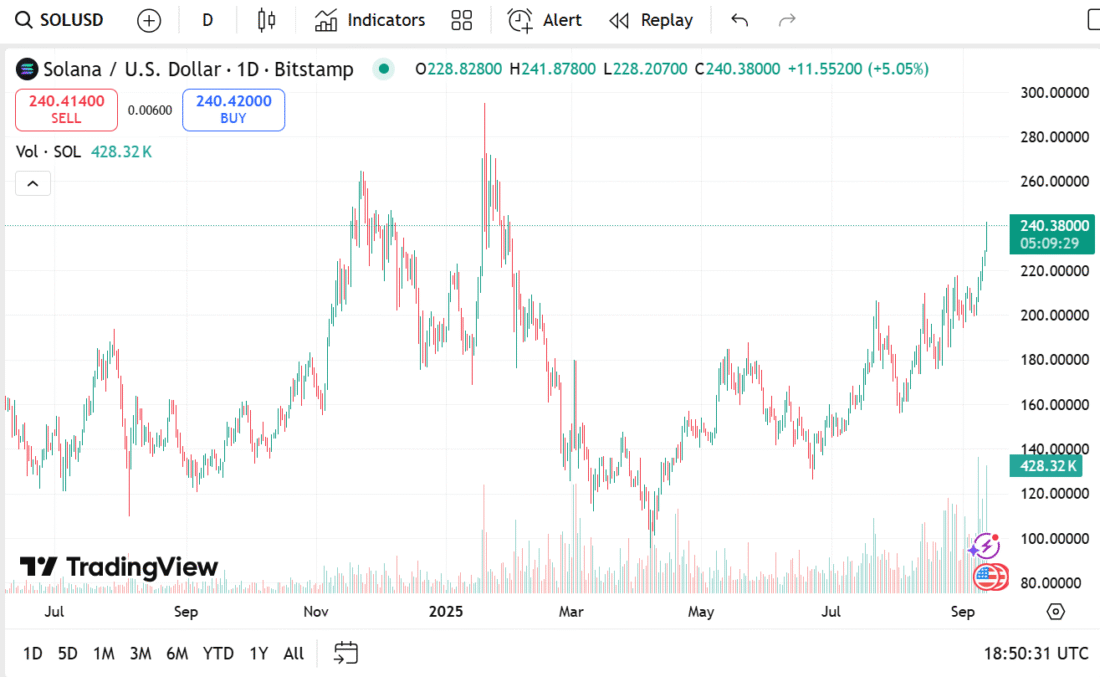 The strength of Solana, however, lies in its ability to deliver useful apps with quantifiable growth. Solana now trades at $240.41, up by 5.82%, with a market capitalization of $129.65 billion and trading volume increasing by 32.96% to $12 billion. This comes on the backdrop of increasing developer activity and increased demand for its DeFi and NFT ecosystems.