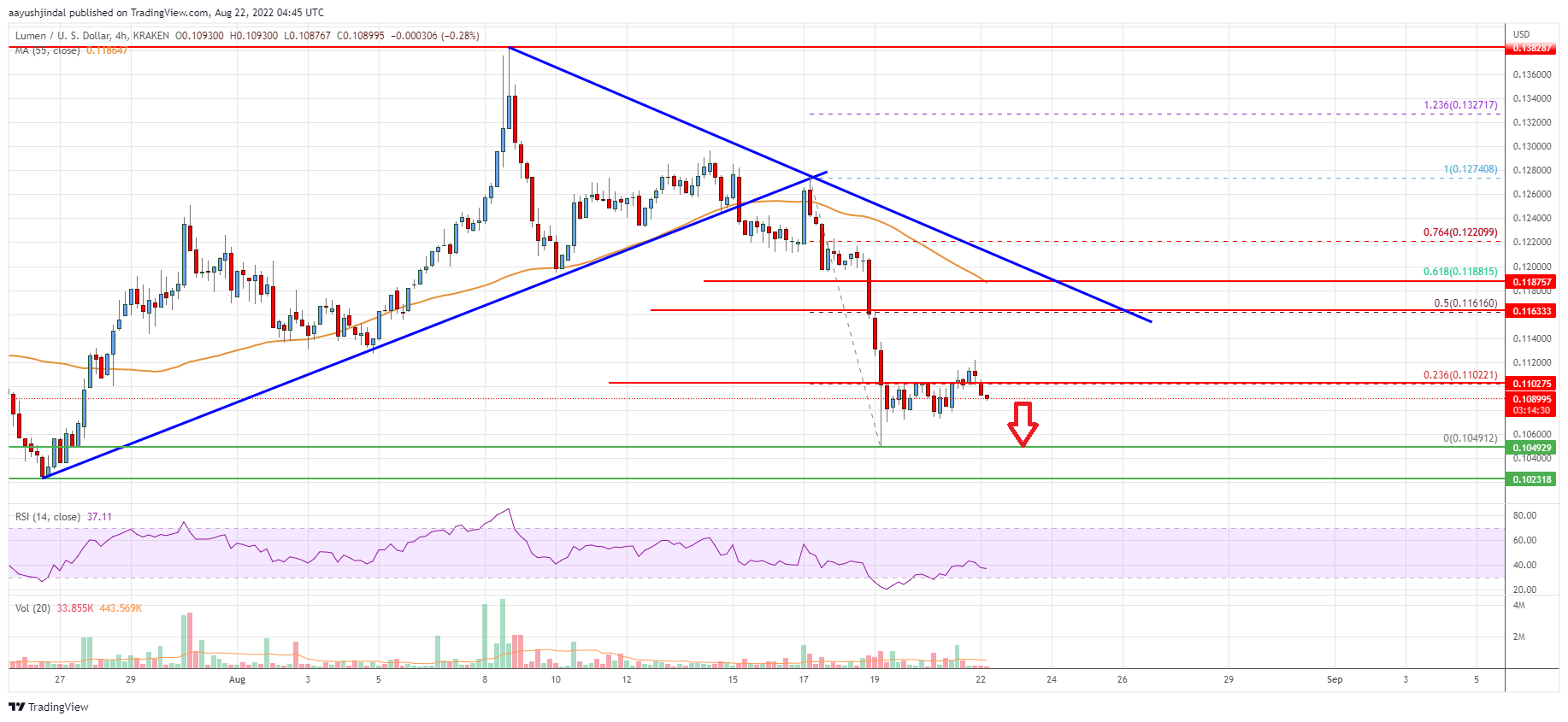 - XLM price is now trading below $0.1150 and the 55 simple moving average (4-hours).