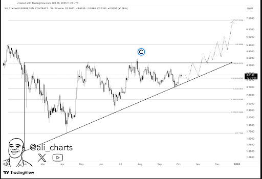Market analyst Ali Charts noted on X that the accumulation phase for SUI looks nearly complete. He mentioned that the current zone is a potential loading area before a breakout toward $7. His observation reflects the sentiment of several market participants who see growing confidence in SUI’s structure.