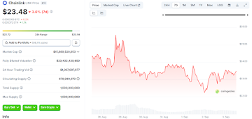 Unlike XRP, Chainlink (LINK) is flashing a more bullish setup. The token trades around $23.48, with analysts spotting a symmetrical triangle pattern often preceding sharp breakouts.