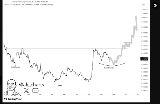 Ali Charts posted on X that Stellar is forming the right shoulder of a head-and-shoulders pattern. According to him, the left shoulder formed in February, while the head developed during the May–June lows. The current structure suggests the possibility of a bullish reversal if the neckline is broken.