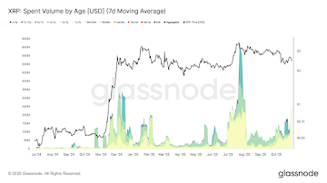 Glassnode’s latest numbers show these experienced holders boosted their daily XRP spending by almost 580%, jumping from $38 million to $260 million (based on the 7-day average). That’s a big spike, and it looks like plenty of them are cashing in after the drop.